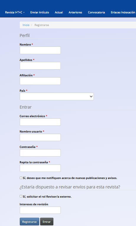 Para realizar un envío a una revista en OJS 3, primero es necesario que registrar una cuenta de usuario en una revista e iniciar sesión (vea Registrate en I+T+C).